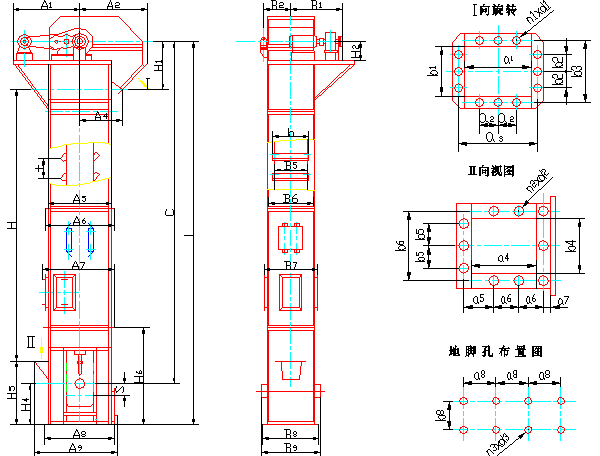 提升機 | 輪廓高度 | 正機結(jié)構(gòu)尺寸 | 料斗 | 地角孔尺寸 | ||||||