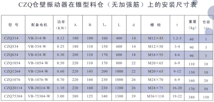 CZQ倉壁振動器是一種以振動電機為激振源的一種新型防閉塞裝置,將該裝置安裝于各種料倉上,通過振動可使料倉中結(jié)拱的物料發(fā)生變位運動,從而起到解拱作用。