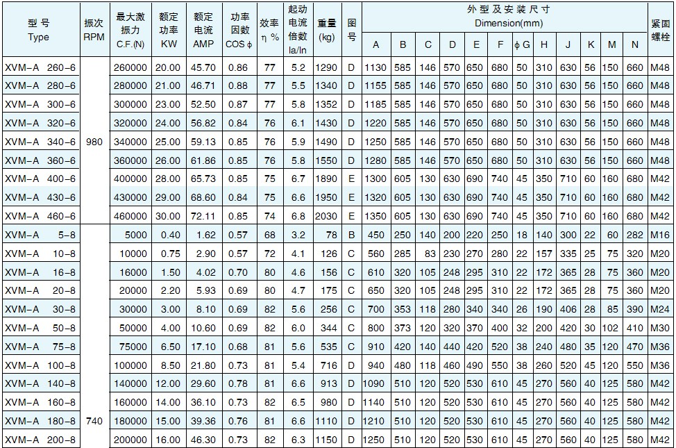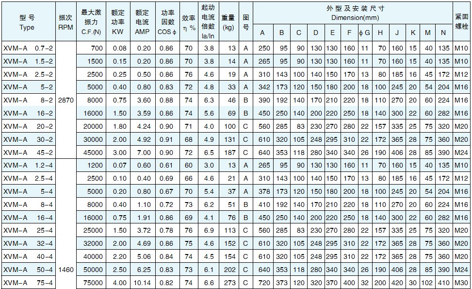 XVM-A系列振動電機(jī)相關(guān)技術(shù)參數(shù):