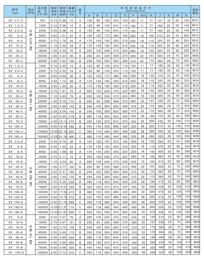 XV系列振動電機技術(shù)參數(shù):