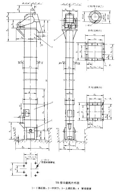 TB型垂直斗式提升機的結(jié)構(gòu)形式繁多,請按《TH、TB型垂直斗式提升機選用與使用說明書》進(jìn)行選型設(shè)計,提供訂貨總圖或委托制造單位選型設(shè)計,但需提供所必需的原始資料。安裝基礎(chǔ)螺栓由用戶自備。