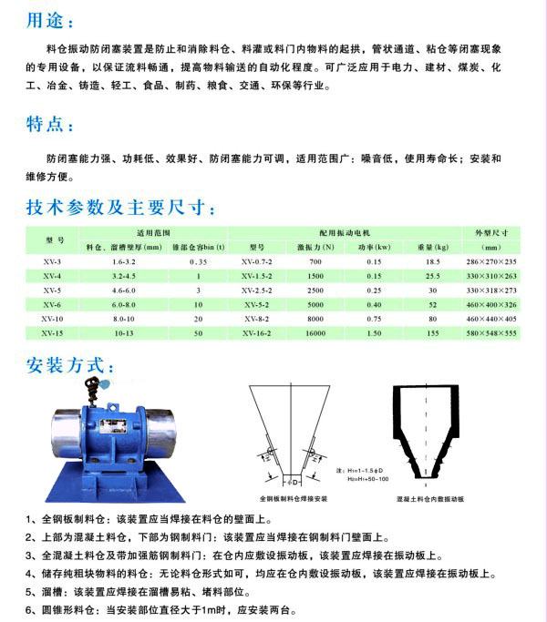 咨詢(xún)熱線:15544296999 XV系列倉(cāng)壁振動(dòng)器(防閉塞裝置)能力強(qiáng),體積小、功耗低,結(jié)構(gòu)簡(jiǎn)單,激振力無(wú)極調(diào)節(jié),適用范圍廣,噪音低,壽命長(zhǎng)、安裝使用方便等特點(diǎn)。